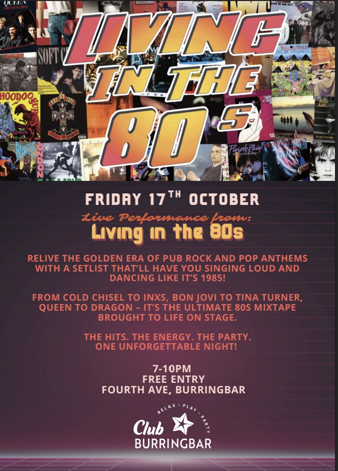If you remember 'Dancing in the Dark', 'Working for the Weekend', 'Should I stay or should I go', 'Nips are getting bigger' and 'Red Red Wine' don't miss Burringbar's big 80s party at the Club on Friday night 17 October. Free entry. Dress up if you wish to be totally rad. For more information on the band and to check out the rest of their playlist visit: http://www.rhodetripent.com/livinginthe80s